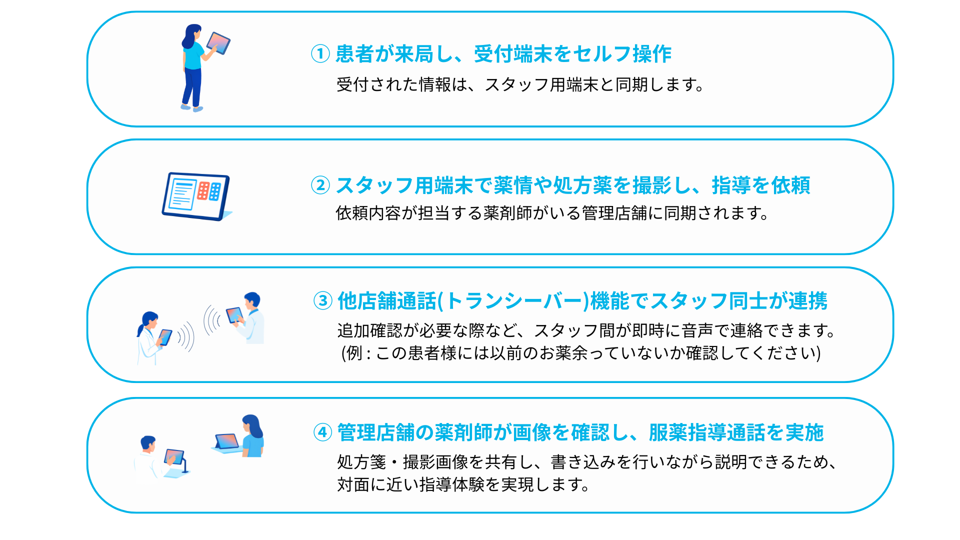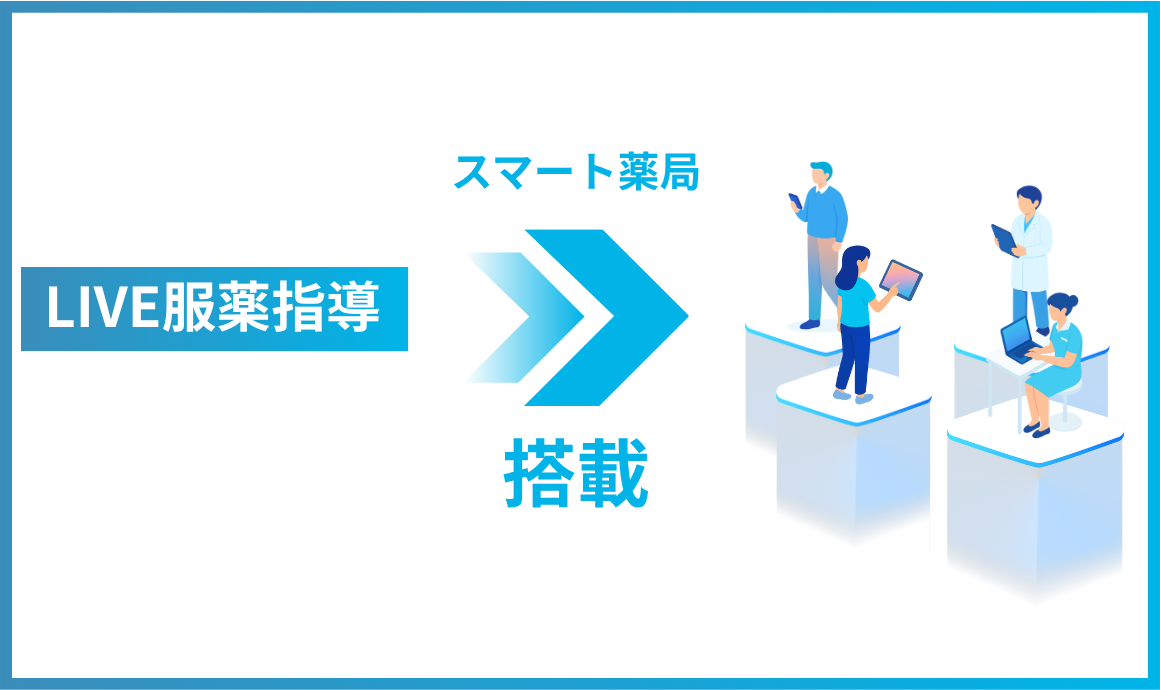 今回新たに加わった「LIVE服薬指導」により、店舗間をつないで薬剤師が服薬指導を行うことができ、来局した患者は、受渡店舗内に設置された端末から通話に参加して従来と同じ感覚で説明を受けることができます。
